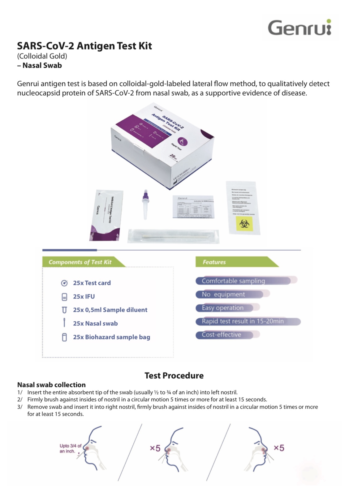 Antigénový test Genrui SARS-CoV-2 (koloidné zlato) je imunochromatografická metóda na rýchle a