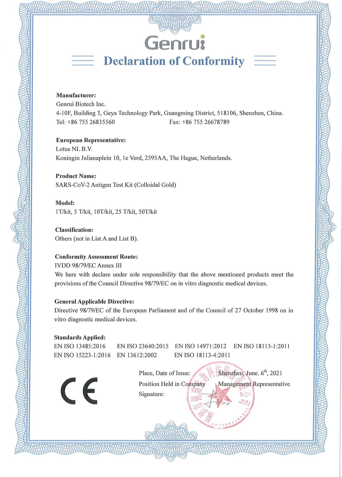 Každá testovacia karta má zabudovaný kontrolný prvok. Červená čiara na kontrolnom prúžku sa môže považovať za vnútornú pozitívnu kontrolu procesu. Ak bol postup vykonaný správne, zobrazí sa kontrolná čiara. Ak sa kontrolná čiara nezobrazí, test je neplatný a musí sa vykonať nový test. Ak problém pretrváva, používanie tejto šarže výrobkov by sa malo okamžite ukončiť a mal by sa kontaktovať miestny predajca, ktorý poskytne technickú podporu. 16. Rušivá látka (1) Hlien ≤10 g/l, krv ≤ 10%, hnis ≤ 5% nemôžu ovplyvniť výsledky testu. (2) Oxymetazolín ≤ 0,375 mg/ml, dexametazón ≤ 2,5 mg/l, síra ≤50mg/ml, Zanamivir ≤ 1,25 mg/l, Mupirocín ≤ 5 mg/ml, Tobramycín ≤ 0,8 mg/l nemôžu ovplyvniť výsledky testu. (3) Výsledky nepreukázali žiadnu skríženú reaktivitu s týmito látkami: Potenciálna krížový reaktant Testovaná koncentrácia Ľudský koronavírus 229E (tepelne inaktivovaný) 1,0 x 105 TCID50/ml Ľudský koronavírusOC43 1,0 x 105 TCID50/ml Ľudský koronavírusNL63 1,0 x 105 TCID50/ml Adenovírus 1,0 x 105 TCID50/ml Ľudský metapneumovírus 1,0 x 105 TCID50/ml Vírus parainfluenzy 1 1,0 x 105 TCID50/ml Vírus parainfluenzy 2 1,0 x 105 TCID50/ml Virus parainfluenzy 3 1,0 x 105 TCID50/ml Vírus parainfluenzy 4 1,0 x 105 TCID50/ml Chrípka A 1,0 x 105 TCID50/ml Chrípka B 1,0 x 105 TCID50/ml Enterovírus 1,0 x 105 TCID50/ml Respiračný syncytiálny vírus 1,0 x 105 TCID50/ml Rhinovirus 1,0 x 105 TCID50/ml HCoV-HKU1 10 μg/ml MERS-CoV nukleoproteín 0,25 ng/ml Haemophilus influenza 1,5 x 106 CFU/ml Streptococcus pneumoniae 1,5 x 106 CFU/ml Streptococcus pyogenes 1,5 x 106 CFU/ml Candida albicans 1,5 x 106 CFU/ml Bordetella pertussis 1,5 x 106 CFU/ml Mycoplasma pneumoniae 1,5 x 106 CFU/ml Chlamydia pneumoniae 1,5 x 106 CFU/ml Genrui Biotech Inc. Web: www.genrui-bio.com L00.2020112503 Staphylococcus epidermidis 1,5 x 106 CFU/ml Staphylococcus aureus 1,5 x 106 CFU/ml Legionella pneumophila 1,5 x 106 CFU/ml Mycobacterium tuberculosis 1,5 x 106 CFU/ml Pneumocystis jirovecii (PJP) 1,5 x 106 CFU/ml Zmesový výplach ľudského nosa 100 % Testovacia súprava má skríženú reaktivitu s nukleoproteínom ľudského SARS-koronavírusu pri koncentrácii 25 ng/ml alebo vyššej, pretože SARS-CoV má vysokú homológiu (79,6 %) so SARS CoV-2. 17. Upozornenia (1) Po otvorení použite testovacie karty čo najskôr. Testovacie karty nepoužívajte opakovane. (2) Nepoužívajte výrobky, ktorým uplynula lehota použiteľnosti. Reakčné činidlá by sa nemali používať, ak je obalové vrecko výrobku poškodené alebo ak roztok na riedenie vzorky uniká. (3) Nemiešajte obsah súprav z rôznych šarží. (4) Pre látky, ktoré obsahujú zdroje infekcie alebo pri ktorých existuje podozrenie, že obsahujú zdroje infekcie, by mali byť zavedené náležité postupy biologickej bezpečnosti. Venujte pozornosť nasledujúcim otázkam: a) Pri manipulácii so vzorkami, dezinfekcii testovacích kariet a spotrebného materiálu po použití a ich ukladaní do vreca na biologický odpad používajte ochranný odev, ochranné okuliare a rukavice. b) Rozliatu vzorku alebo činidlo dezinfikujte dezinfekčným prostriedkom. c) Všetky vzorky alebo činidlá dezinfikujte alebo s nimi manipulujte ako s potenciálnymi zdrojmi kontaminácie v súlade s miestnymi predpismi. d) Po použití zlikvidujte prostriedok v súlade s miestnymi predpismi. 18. Vysvetlenie grafických symbolov Pred použitím si preštudujte pokyny Limit teploty Šarža č. Dátum exspirácie Činidlo na diagnostiku in vitro CONFORMITE EUROPEENNE Dátum výroby Katalógové číslo Výrobca Uchovávajte v suchu Obsah dostatočný pre testov Uchovávajte mimo dosahu slnečného žiarenia Nepoužívať opakovane Autorizovaný zástupca v Európskom spoločenstve 19. Pomoc a informácie Ak potrebujete pomoc, kontaktujte popredajný servis 20. Výrobca Genrui Biotech Inc. Adresa: 4-10F, Building 3, Geya Technology Park, Guangming District, 51
