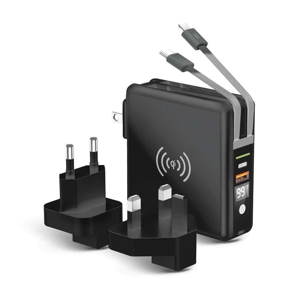 Vynikajúca cestovná sada: Multifunkčná nabíjačka Forcell 5in1. Vybavené vstavanými konektormi: Micro USB, USB-C, Lightning a Power Bank. Umožňuje bezdrôtové nabíjanie.