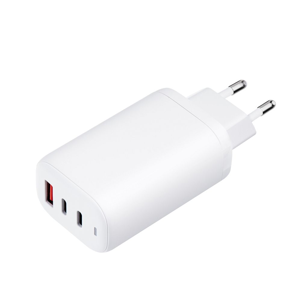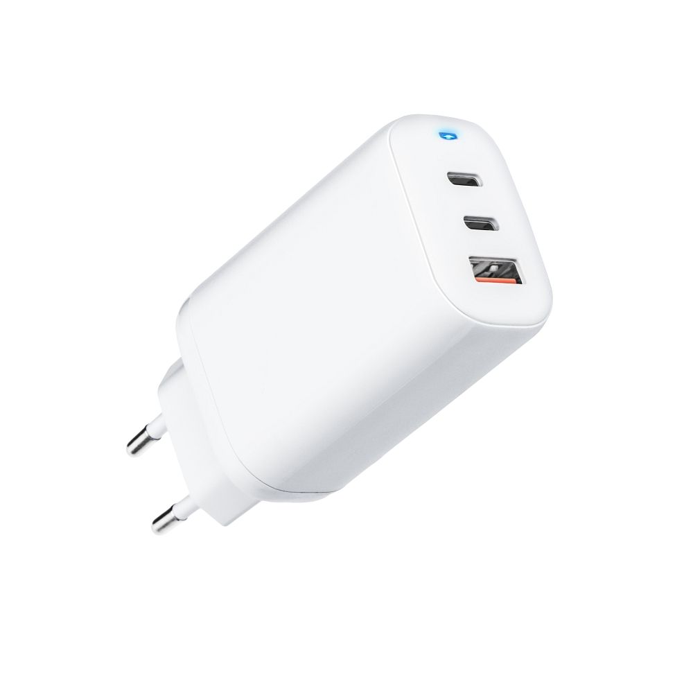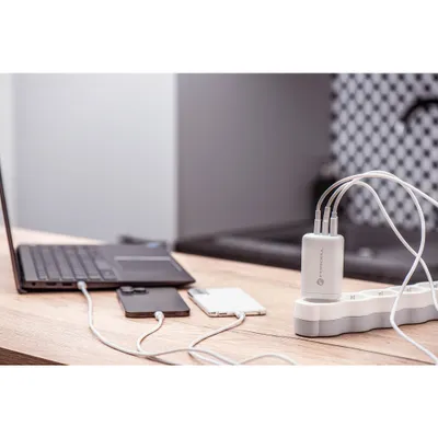 Superrýchla viacportová nástenná nabíjačka Forcell GaN 65W nabíja expresným tempom tri zariadenia súčasne.