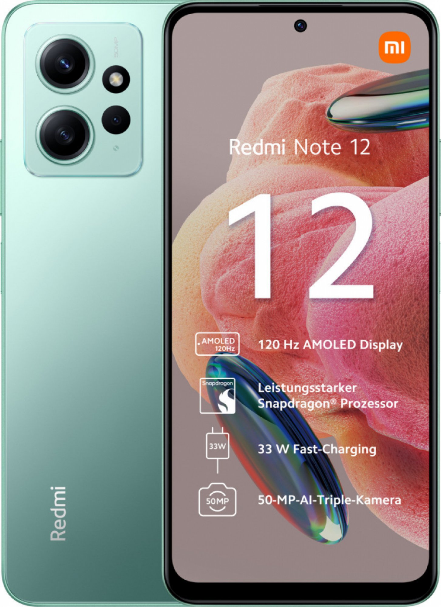 Smartfón Xiaomi Redmi Note 12 je vybavený 6,67″ AMOLED displejom s Full HD+ rozlíšením, troma zadnými fotoaparátmi s rozlíšením 50 Mpx + 8 Mpx + 2 Mpx, 13Mpx prednou kamerou, 8-jadrovým procesorom Qualcomm Snapdragon 685, 4GB RAM, slotom na microSD kartu, 3,5mm jackom, NFC, GPS, batériou s kapacitou 5 000 mAh a 33W nabíjaním. Výbavu telefónu dopĺňa aj snímač odtlačkov prstov na boku.